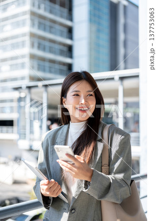 Pretty asian woman student office worker holding phone and tablet looking away walking on footbridge