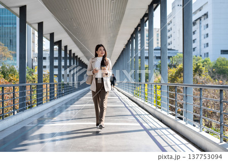 Full body of asian woman office worker holding coffee and phone walking in sunlight on footbridge.