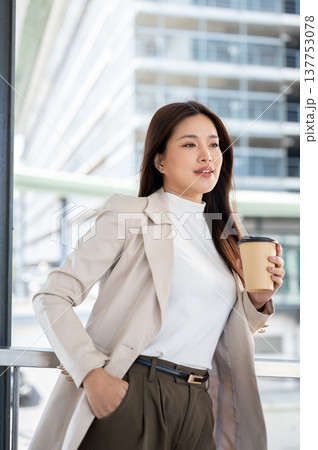 Pretty asian woman office worker holding coffee cup standing aside railing on bridge with cityscape.