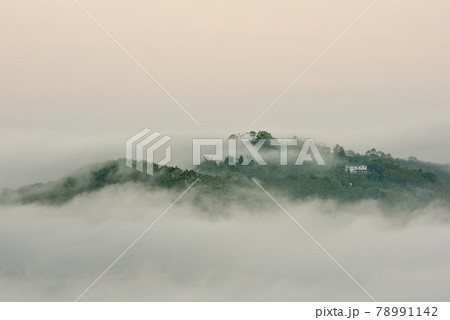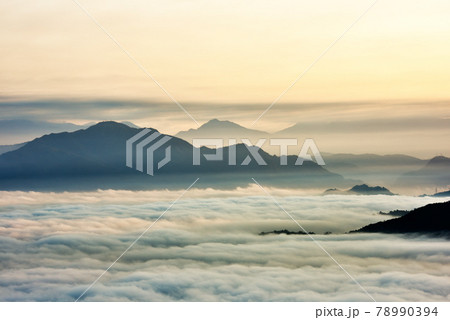 遠處的山地天際線上,清塵的朦朧光芒,空中的雲海,夢幻般的浪漫。