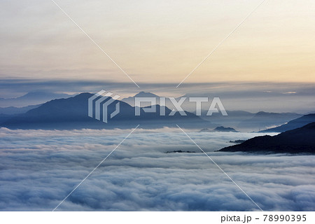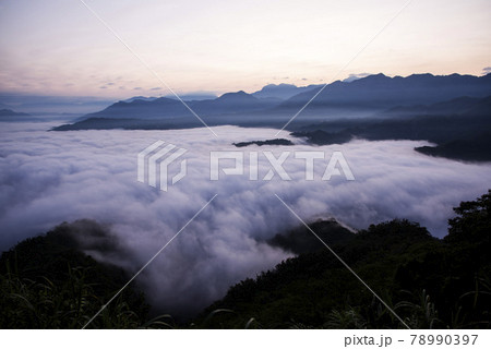 遠處的山天線上,色辰的朦朧光芒,空中的彩雲,大片的雲海,浪漫的幻境。