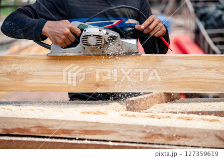 Male carpenter hand using an electric planer on wooden plank at construction site