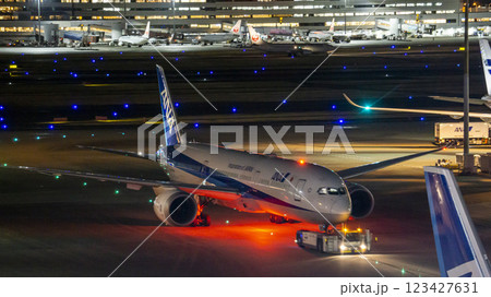 夜晚閃耀羽田機場的全日空波音787:起飛前的場景