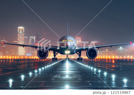 Passenger airplane illuminated on airport runway at night with urban skyline in background