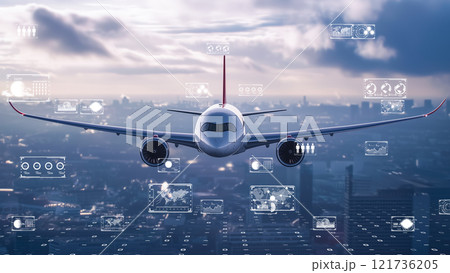 Smiling businesswoman using smartphone on airplane. Concept of in flight communication and business travel