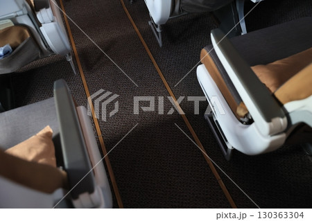 Empty airplane cabin ready for boarding in the afternoon with clean, modern seating layout