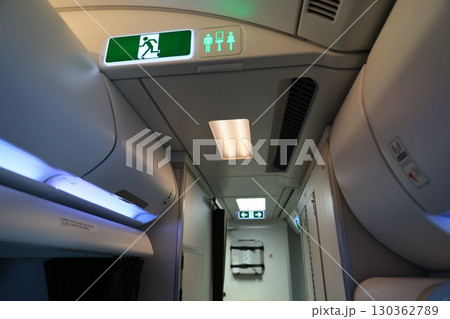 Lavatory door with no smoking sign inside airplane cabin interior. Aviation safety, hygiene facility and airline regulation during passenger air travel.