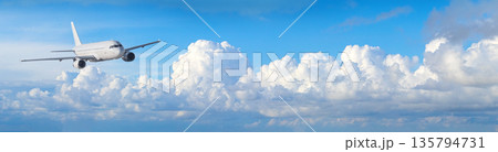 積雨雲鋪展的藍天和大海,船從海岸飄過,飛機飛翔的風景(橫長)