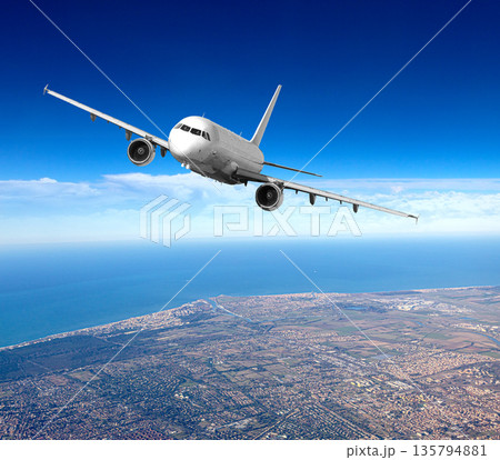 Aircraft wing flying above coast and land. Aerial travel, flight altitude, and global connection through passenger aviation view