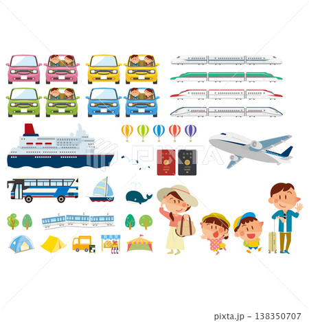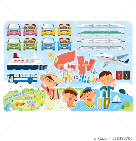 一套描繪家庭享受黃金週的插圖(可供剪貼)。