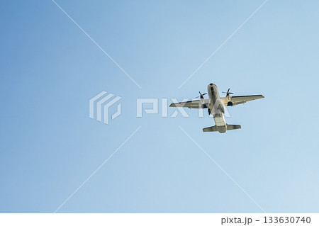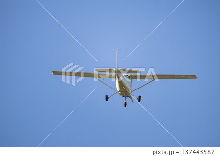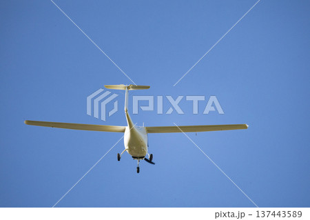 Aircraft flying against a clear blue sky during daylight hours in an open area