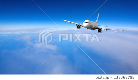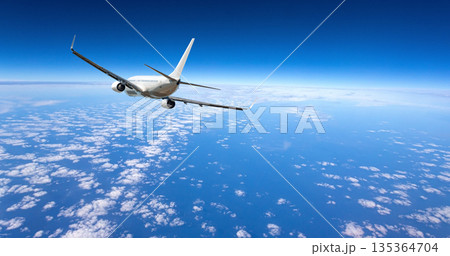 A commercial airplane soars through a bright sky, surrounded by soft clouds, showcasing air travel and freedom in motion.