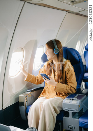 Tired asian woman with headache feeling sick while sitting in the airplane , Passengers near the window.