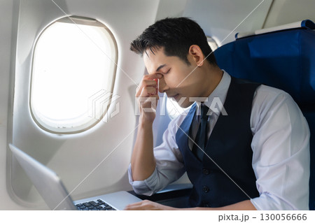 Tired and anxious Asian man sitting on a plane Passengers near the window.