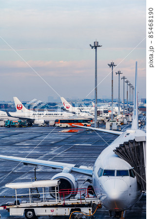 羽田機場2號樓停機坪上停放的客機及城市風光