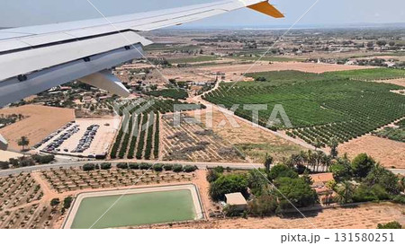Aerial view of landing airplane over a scenic agricultural landscape showcasing rural beauty