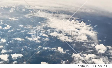 Behold an Aerial View showcasing the magnificent Clouds and Earth from a soaring Airplane