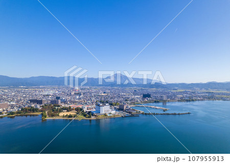 在琵琶湖、長濱市和富士山沿岸建造的長濱城全景航拍。