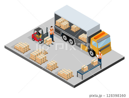 Warehouse Logistic with Workers loading products on the trucks and forklift loading pallets with cardboard boxes.