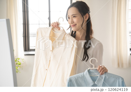 年輕女子在室內選擇衣服