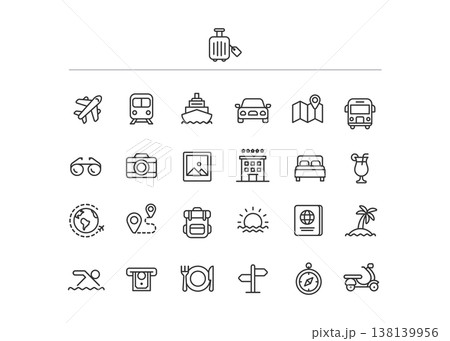 Comprehensive Travel and Vacation Outline Icon Set stock illustration.