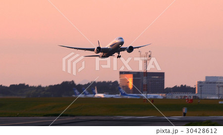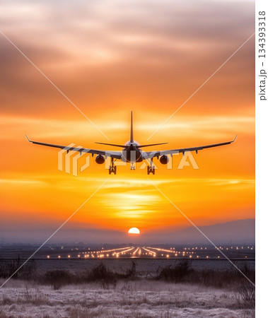 Plane Takes off Against a Stunning Sunset Over the Runway With Vibrant Colors in the Sky
