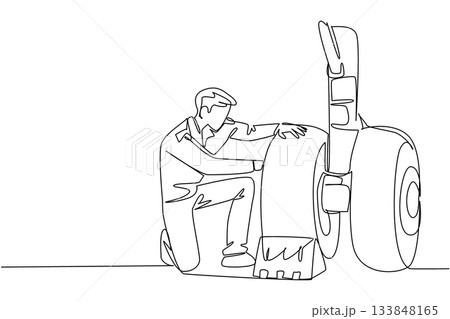 Continuous one line drawing aircraft technician checking the wheels of aircraft. Rechecking the landing control system. Aviation Maintenance Technician Day. Single line draw design vector illustration