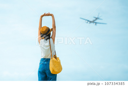 A beautiful Asian female tourist with her luggage is on the airport escalator, traveling by plane.