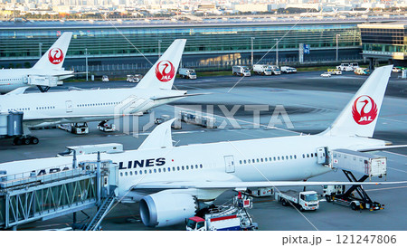 羽田機場的風景:東京大田區的抵達飛機和停機坪