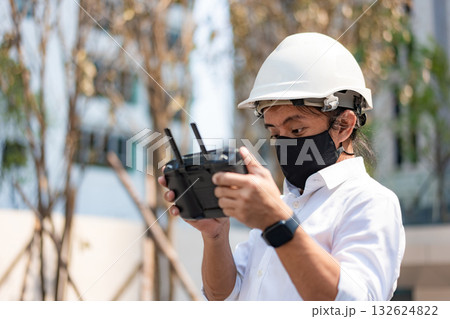 Young businesswoman operating a drone with a remote control in a green park, showcasing innovation and technology in a natural setting