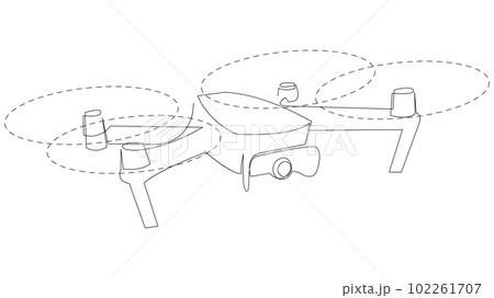 Simple line drawing of flying drone airplane. Minimalist line unmanned plane graphic. Modern air gadget for videography concept. Vector illustration.