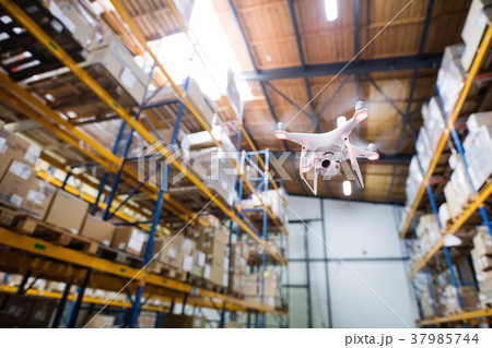 Drone quadcopter with digital camera and fast rotating propellers flying taking video and pictures