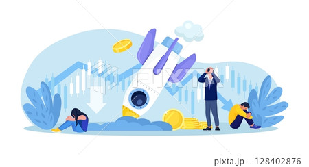 Businesspeople stand at crashed rocket. Fail start up, new business failure. Spaceship fall down. Depressed businessmen company owners sitting near crash launching space rocket Entrepreneur bankruptcy