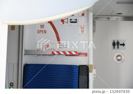 Airplane interior signage showing exit and lavatory icons. Flight safety, directions, and passenger information during air travel.