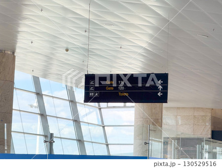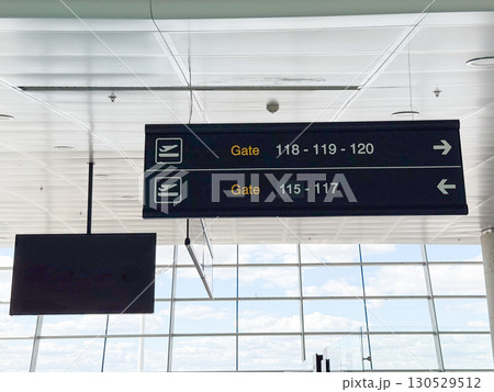 Airport directional sign with gates information in terminal hall. Travel navigation, passenger guidance, and public facility signage for aviation infrastructure.