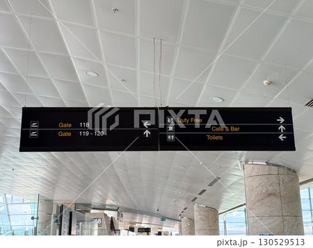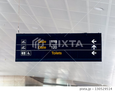 Airport direction signs for boarding gates and facilities. Navigation, travel guidance and passenger services in transport hub.