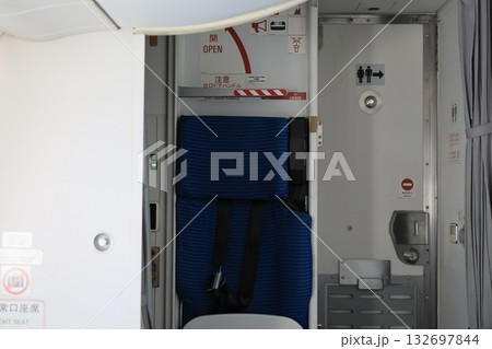 Airplane cabin interior with seatbacks showing safety labels. Air travel, passenger security and onboard aviation details.