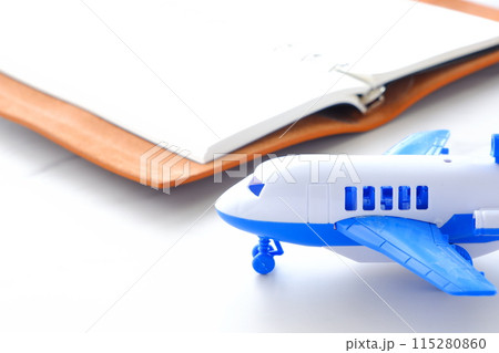 帶著飛機和打開的環形筆記本規劃下一個長假旅行的圖像。