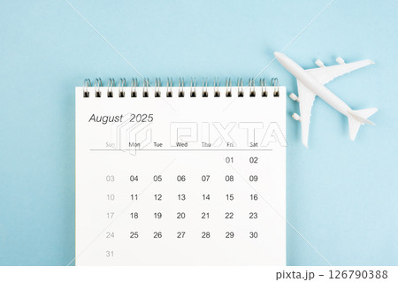August 2025 calendar and airplane toy on blue background, Travel plan concepts.