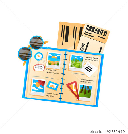 Travel album with photos aand luggage stickers vector cartoon illustration.
