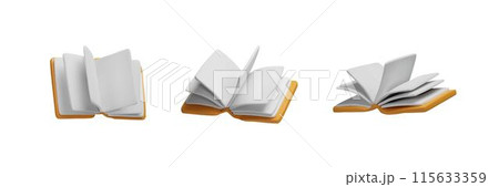 Open paper book with white pages and blue hard cover flying in air in different angles of rotation. 3D render illustration set of cartoon floating literature for reading and education concept.