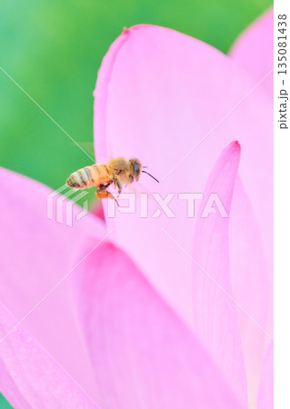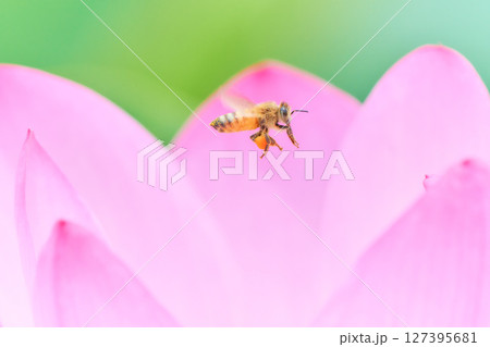 一隻蜜蜂飛過一朵粉紅色蓮花