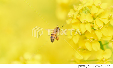 一隻蜜蜂在油菜花上盤旋採集花粉