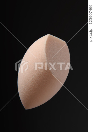 Beauty blender on black background. Light beige sponge for cosmetics with a cut. Makeup products. Beauty concept. Place for text. Place to copy. Levitation.