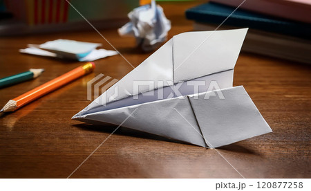 A paper airplane is on a table with a pencil and a crayon