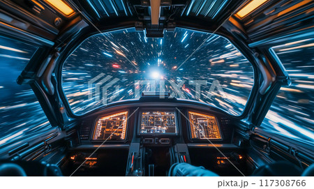 Futuristic spaceship cockpit. Hyper jump view from space station cabin with high tech control panel, pilot seat and cosmic backdrop. Cartoon interstellar travel vector illustration