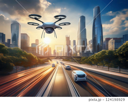 Future technology of autonomous logistics concept. Delivery drone flying background. Generative AI
