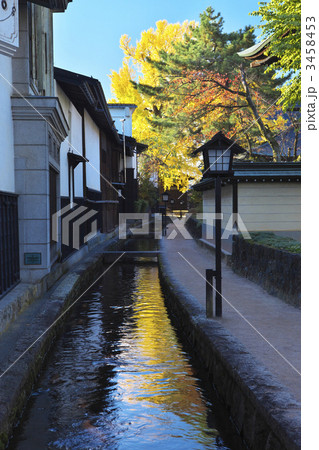 城下町的舊街景 古老的聯排別墅和鯉魚遊動的水道的景觀