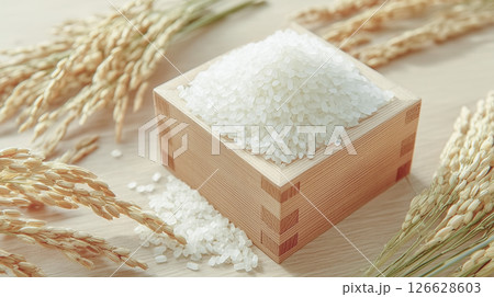 日式風格的圖像,在枇杷盒中盛放著白米飯和稻穗。讓人聯想到秋收的稻米