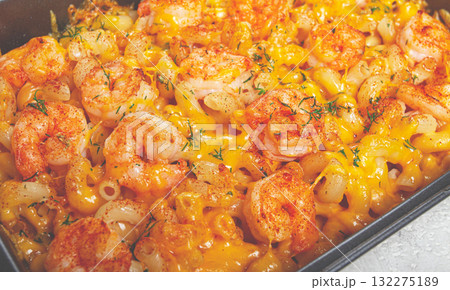 pasta with shrimp and cheese, with a golden crust, cooked in a baking dish, homemade, no people,